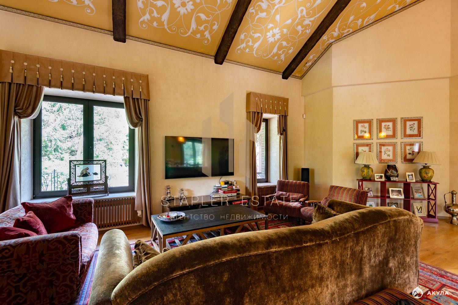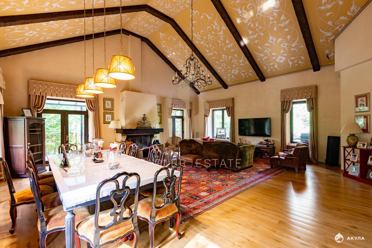 - Гостиная с дровяным камином и выходом на террасу.