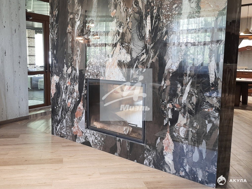 Общее пространство кухни-гостиной разграничено двусторонним камином, облицованным натуральным камнем, с выходом на террасу